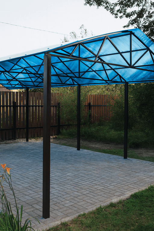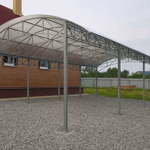 Такие навесы для автомобиля из труб легко интегрируются в ландшафт, обеспечивая защиту и удобство эксплуатации круглый год.
